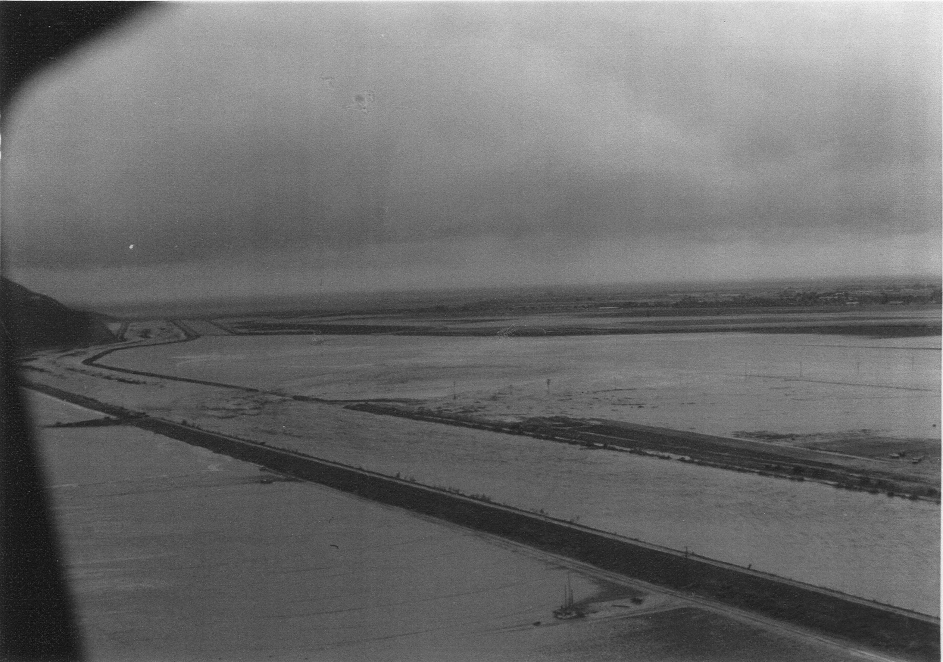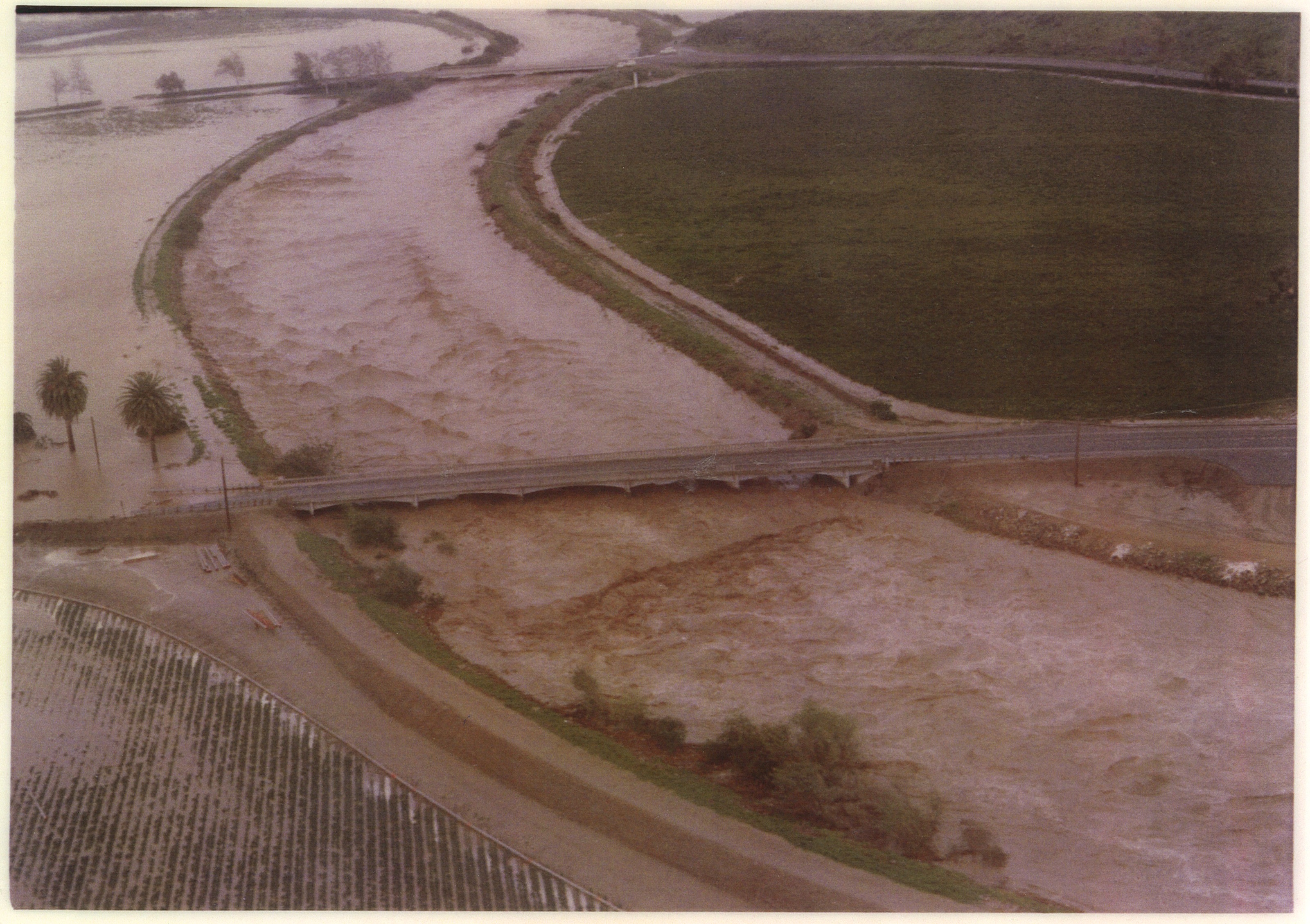 Multiple failures of levees along Calleguas Creek flooded agricultural fields between Calleguas Creek and Revolon Slough. Flooded agricultural fields lead to the failure of the Revolon Slough levee at Las Posas Road. Agricultural fields next to Camarillo State Hospital (now CSUCI) were also flooded. Major damage to Lewis Road due to breakouts. |